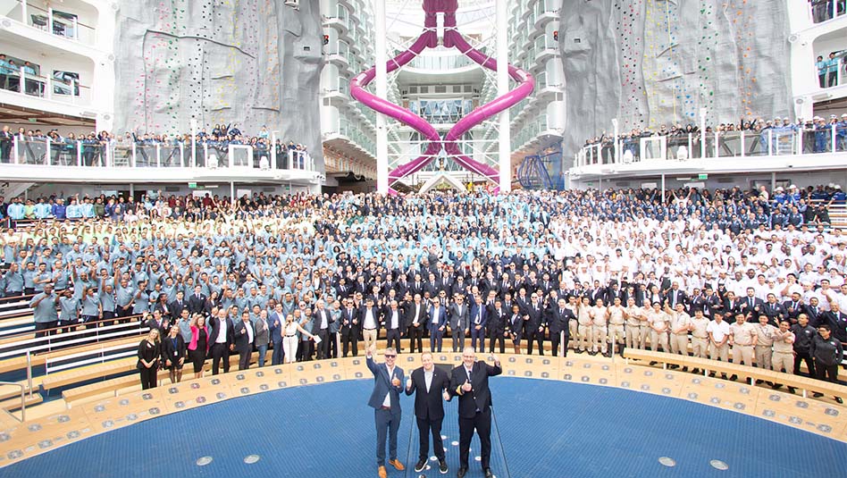 1,600 אנשי צוות נאספו לציון הרגע במתחם AquaTheater. נשיא ומנכ”ל קבוצת רויאל קריביאן ג’ייסון ליברטי (Jason Liberty), נשיא ומנכ”ל רויאל קריביאן אינטרנשיונל מייקל ביילי (Michael Bayley) והמנכ”ל של Chantiers de l’Atlantique Laurent Castaing נכחו באירוע שהכיר בהישגיהם של המהנדסים הימיים, המעצבים, האדריכלים ועוד.